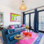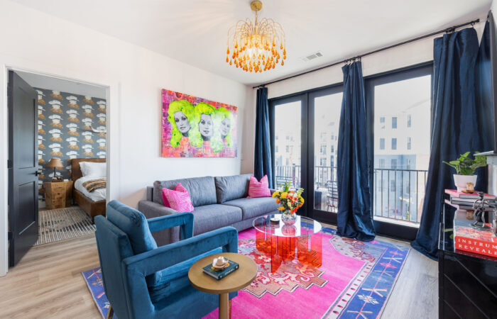 Music City Magnolia property living room — Dolly Parton art, pink rug, blue velvet chair